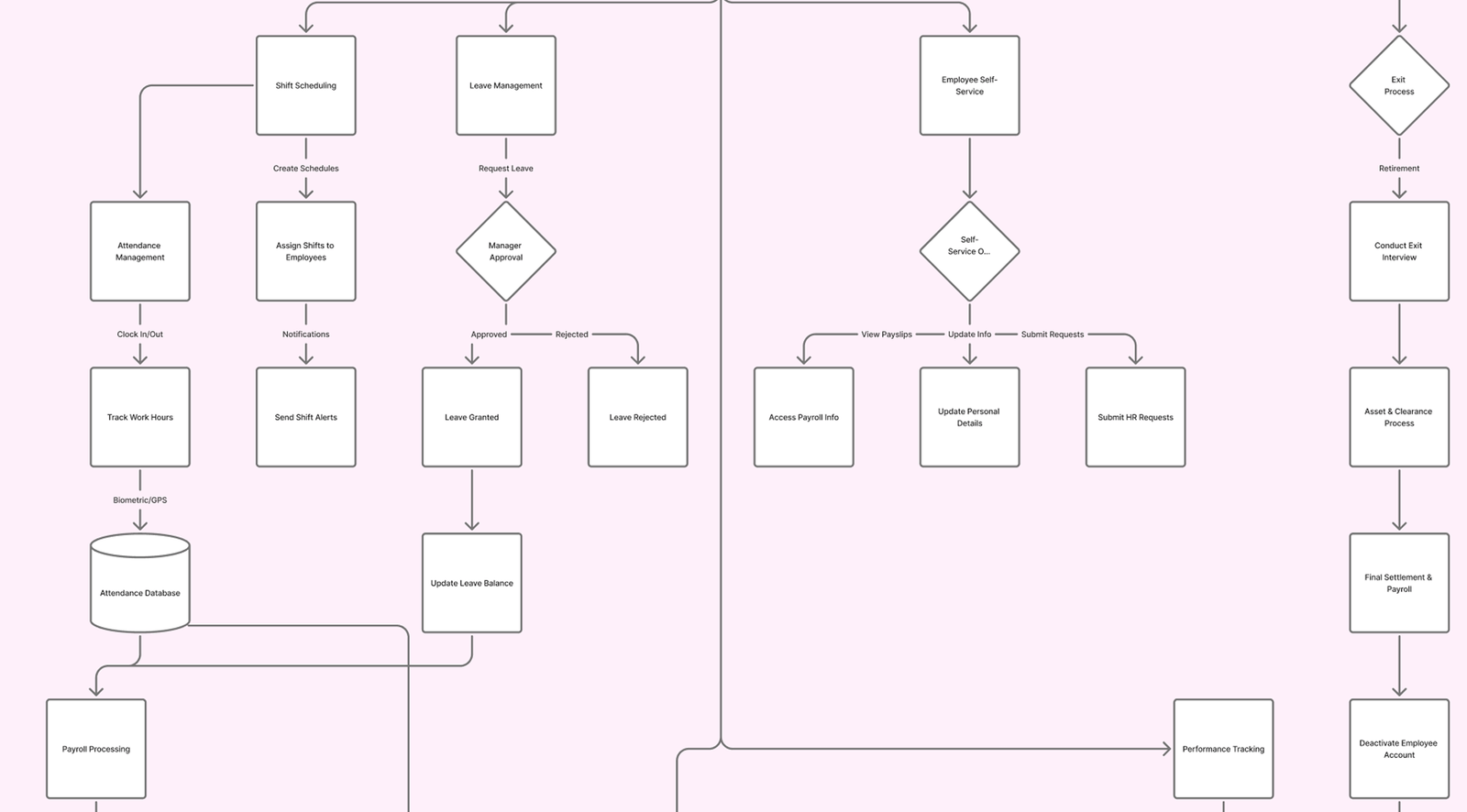 A high-level journey showing how HR managers handle employee onboarding, Attendance , Employee